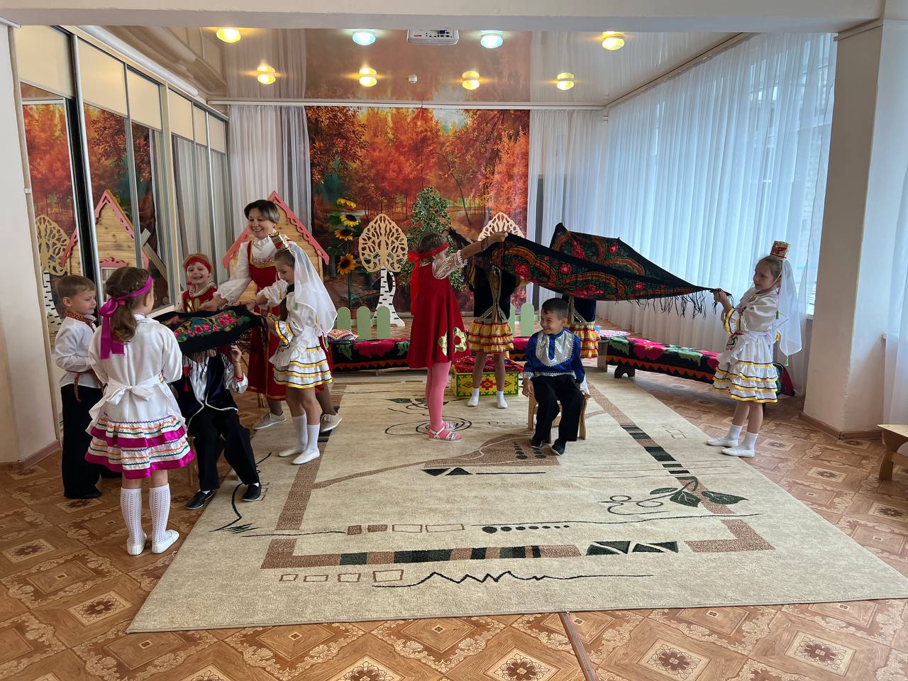В течение всего дня дошкольники вместе с педагогами играли в народные игры «Юрта», «Липкие пеньки», «Ручеек» и в дидактические игры «Сложи узор», «Укрась национальное платье», рассматривали альбомы и иллюстрации, разукрашивали костюмы, рисовали, делали аппликацию. Воспитатели провели беседы по теме «Самобытность национального костюма». В младших группах детям были предложены для рассматривания куклы в национальных костюмах.