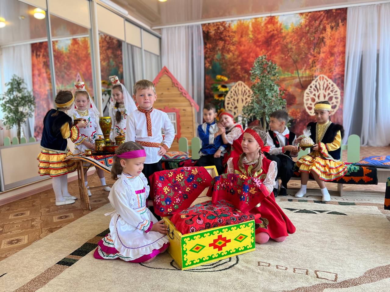 Музыкальный руководитель Кабылова Д.М. и воспитатель Ганеева С.Г. с детьми группы №12 «Пчелка» провели тематическое занятие «Бабушкин сундук», на котором дети познакомились с национальным костюмом башкир, татар, русских и марийцев. С большим удовольствием ребята надели на себя костюмы и танцевали в них, разучивая элементы народных танцев.