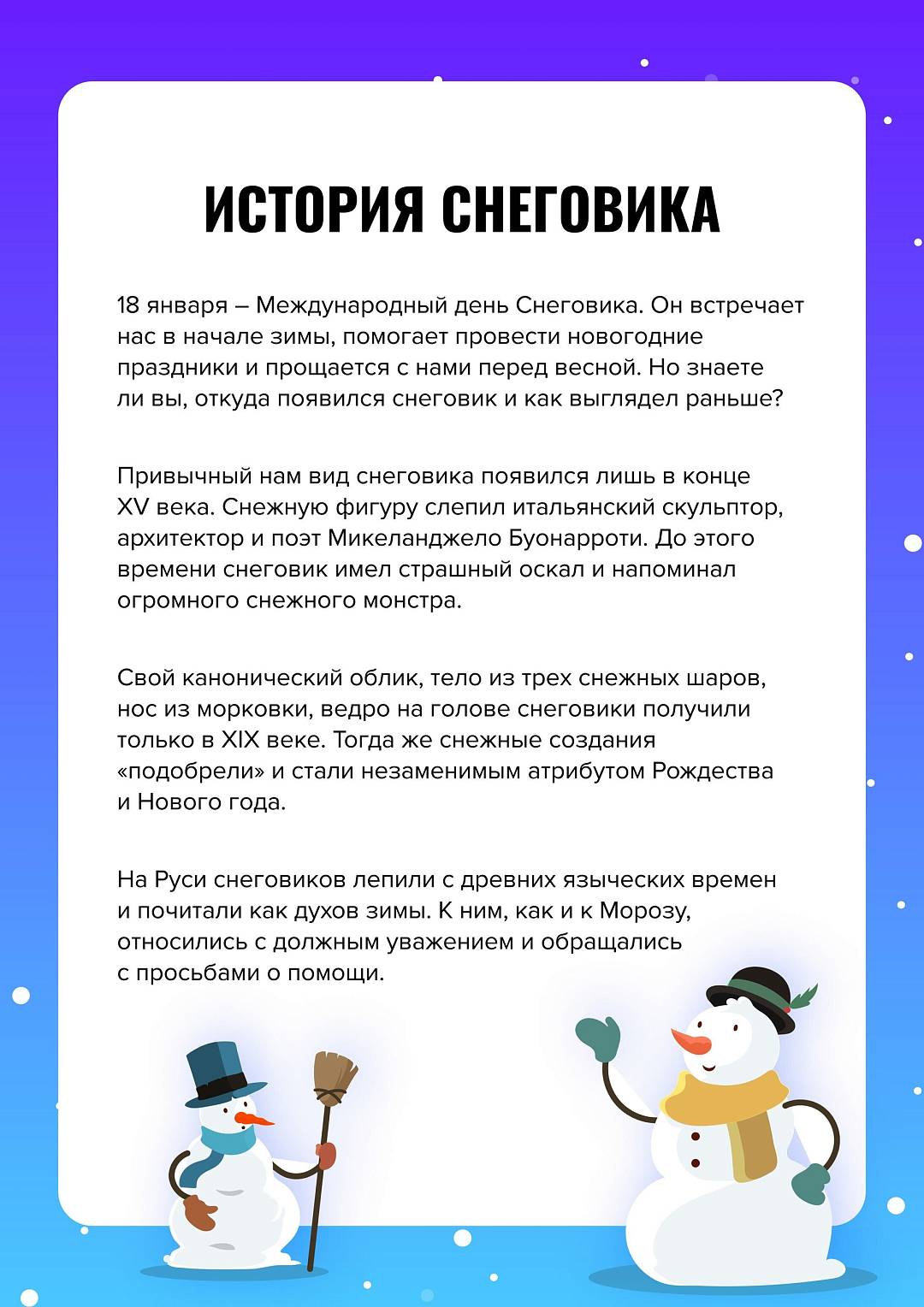 Так что 18 января — отличный повод выйти на улицу, слепить своего снеговика и, по старинной традиции, прошептать ему на ушко заветное желание!