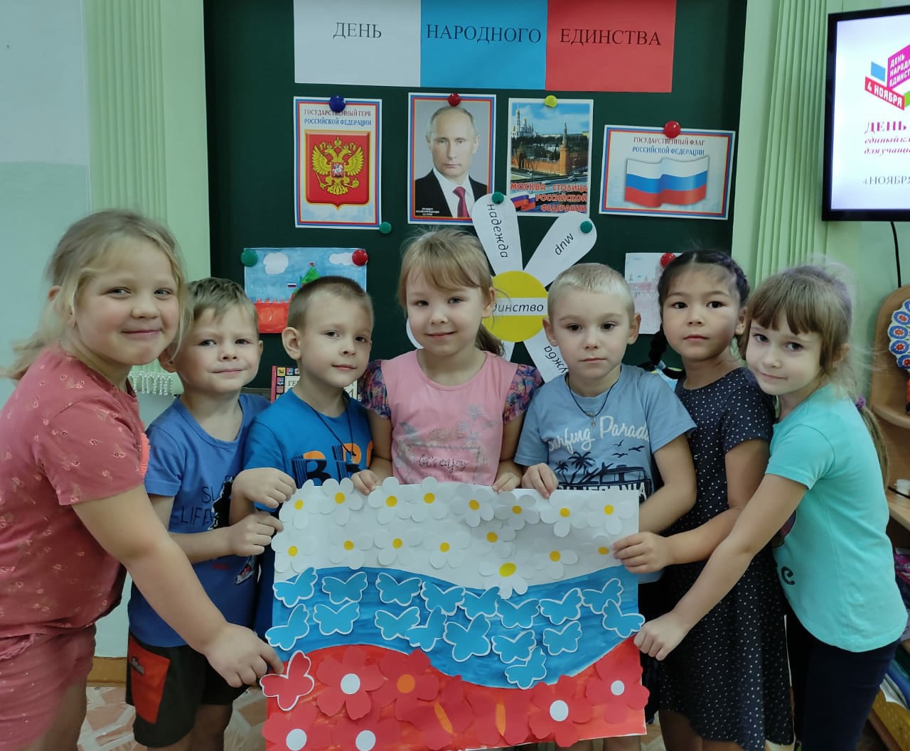 День Народного Единства- это прежде всего экскурсия в историю. В преддверии праздника для ребят старшей группы "Пчелка" воспитатели подготовили цикл мероприятий по ознакомлению с героическим прошлым своего народа.Познакомили с историей возникновения праздника, подвигами наших предков во имя независимости.Провели беседы : " О подвиге Минина и Пожарского" ,Россия- многонациональная страна"С большим интересом рассматривали ее необъятные просторы. Вспомнили государственные символы: герб,флаг,послушали гимн. Коллективная работа была итогом недели.Ребята изготовили российский флаг ,а еще из лепестков, на которых были написаны слова: Мир,Дружба, Согласие,Надежда,Объединение, Доброта, Милосердие ,ребята составили цветок,центром которого стало слово - Единство .